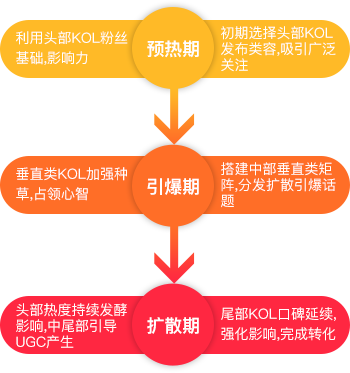 搭建金字塔型KOL矩陣,通過互動話題和不同量級KOL的排兵布陣,實現全面擴散甚至病毒式傳播。階段式持續推動營銷信息擴散;
